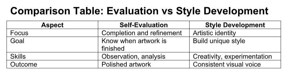 Self-assessment enables artists to discover what strengths they have, how they can develop their technique, and how they can decide when a work is complete with confidence, supporting how to critically evaluate your own work and know when it’s finished.